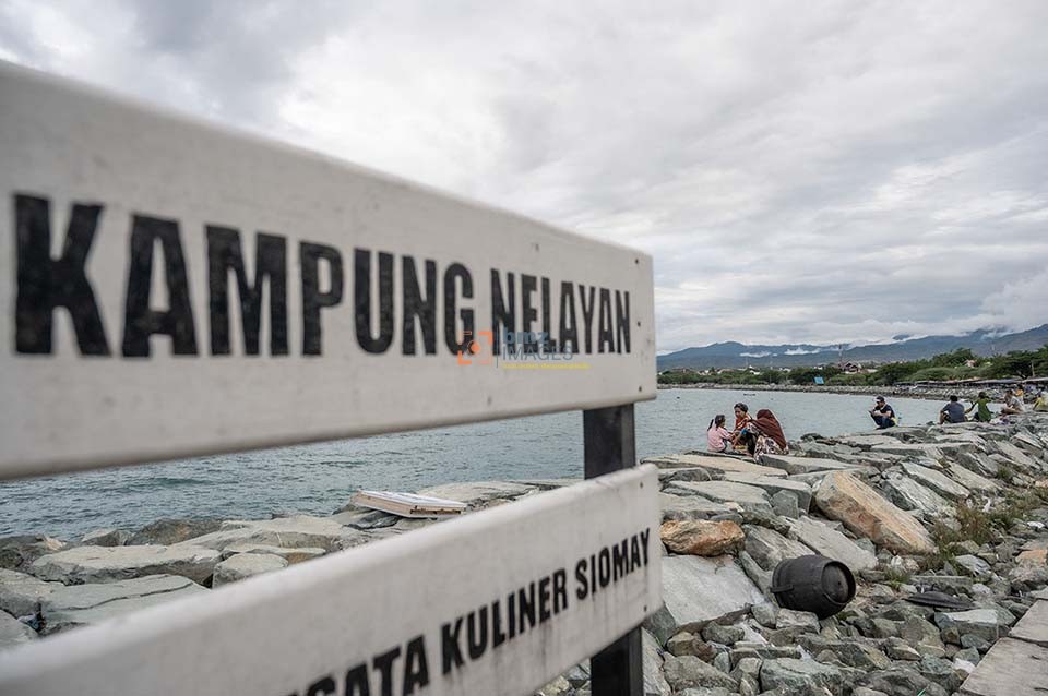 Pengunjung menikmati suasana sore saat berlibur di Pantai Kampung Nelayan di Palu, Sulawesi Tengah, Kamis (11/4/2024).