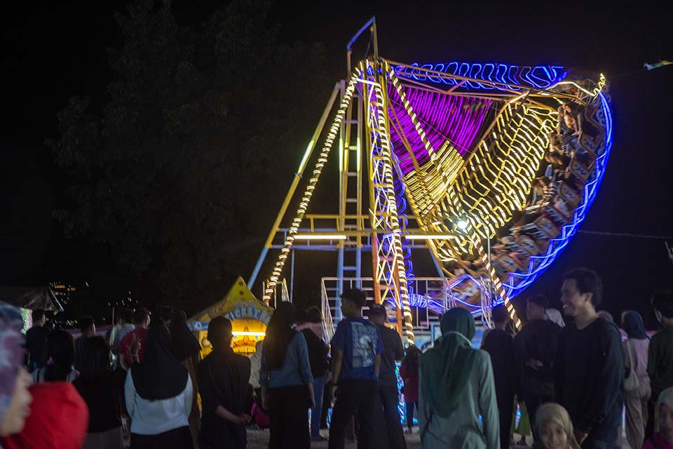 Pengunjung menikmati permainan di wahana permainan saat berwisata lebaran di Pasar Malam di Palu, Sulawesi Tengah, Minggu (14/4/2024). Sebagian warga di wilayah itu lebih memilih berwisata lebaran di Pasar Malam karena selain biayanya relatif lebih murah, juga menyediakan wahana permainan yang beragam. bmzIMAGES/Basri Marzuki