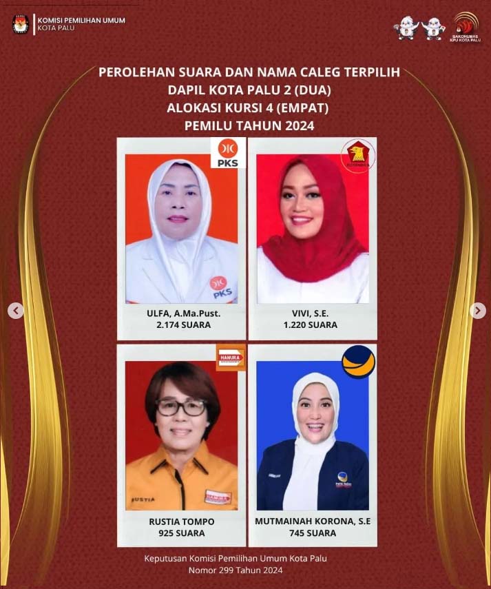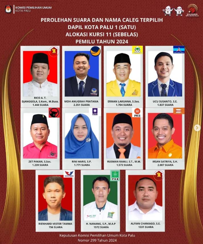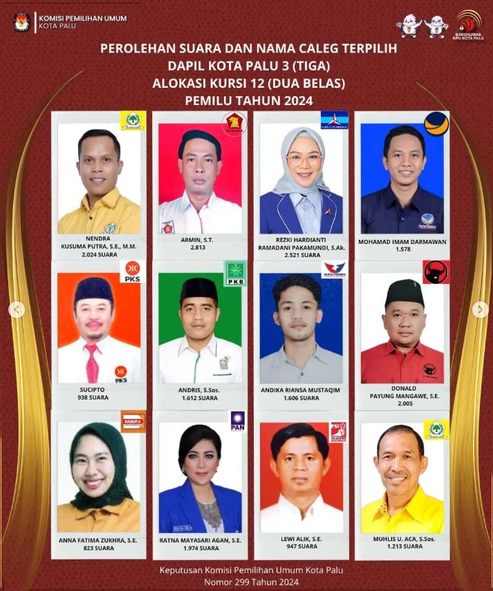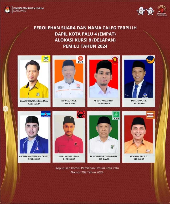 Keputusan itu dituangkan dalambentuk Keputusan Nomor 300 Tahun 2024 Tentang Penetapan Calon Terpilih Anggota Perwakilan Rakyat Daerah (DPRD) Kota Palu Dalam Pemilihan Umum Tahun 2024.